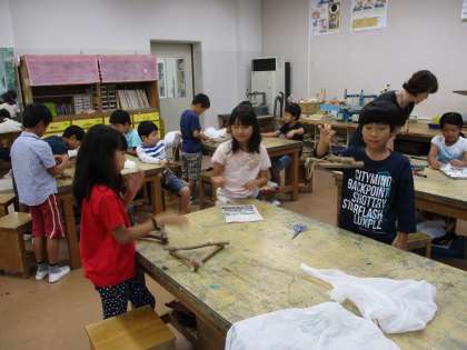 まず、長い木の枝を3つにノコギリでカットしていきました。今回初めて使ったという子もいて、緊張しながら作業をしていました。