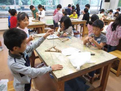 次に、ひもでそれらを三角形に結び、固定しました。作業を始めると、ひもを結べない子が思いのほか多く、「これを機会に練習しなきゃね。」と話しました。