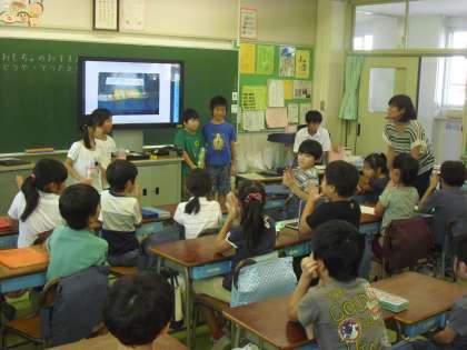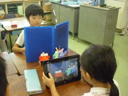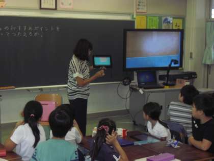 本校で取り組んでいる情報機器を活用した学習に関する研究の一例として、今週導入されたばかりのタブレット端末を用いています。