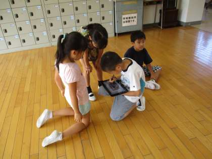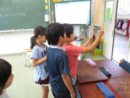 先日烏山小学校に導入されたタブレット端末を、教室の外に持ち出して使ってみました。