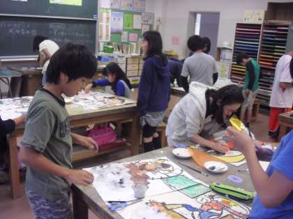 2組は図工「墨のうた」の学習で風神、雷神図をモチーフにした絵をかいていました。個性あふれるアレンジがとてもよい味を出しています。