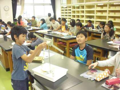 3組は理科「てこのしくみとはたらき」の実験中でした。左右で異なる位置におもりを下げて、つり合うときのきまりについて班で協力して確かめていました。
