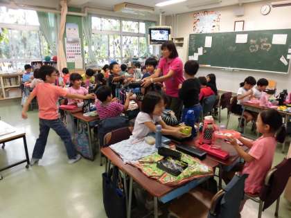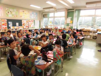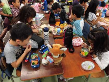 お昼には、おうちの方に作っていただいたお弁当を教室で食べました。教室でお弁当を食べるのは初めての経験で、みんなとても嬉しそうな顔をしていました。