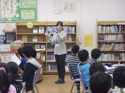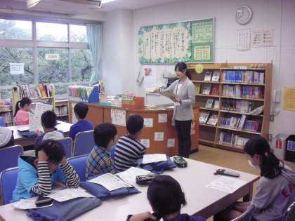 9月から学校図書館の運営が変わり、利用方法も新しくなりました。司書の相原さんからガイダンスを受けて早速本を借りる子どもたち。