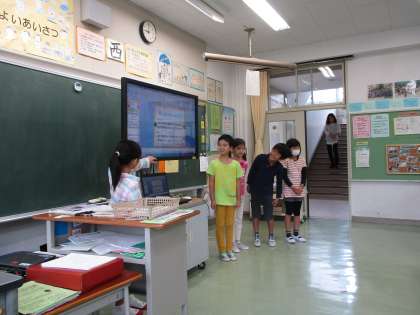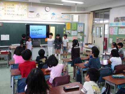 今回の発表では、電子黒板にグループの提案を映し出し、タブレット端末で操作しながら画面を切り替えていきました。端末が突然フリーズしたりするなどアクシデントもありましたが、自分たちでICT機器を使って友達に考えを伝えることができました。