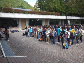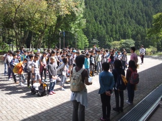 宿舎前の広場で開室式を行い、宿舎の方々へもあいさつをしました。また、宿舎正面のポールに校旗を掲げました。ここ川場村での生活が始まりました。