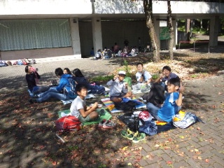 待ちに待ったお弁当の時間です。宿舎前の広場で食べています。朝が早かったので食欲旺盛な子どもたちです。