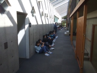 避難訓練をしました。男子棟、女子棟そろって、非常放送の指示を聞き、人数確認と避難経路の確認をしました。