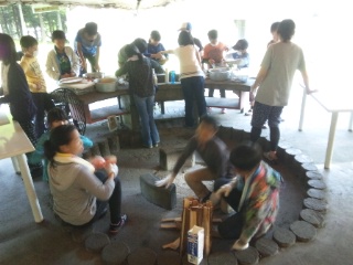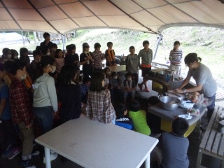 いよいよ飯ごう炊さんが始まりました。補助員さんから、かまど班とカレー班ごとに、準備と作業・調理の手順について説明を受けました。さあ、活動開始です!