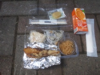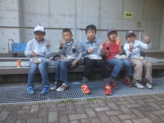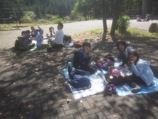 全員が21世紀の森を歩き切りました。行動班で力を合わせ、ふじやまビレジに戻ってきた表情には、笑顔がいっぱいでした。補助員さんからお弁当を受け取り、お祭り広場で仲よく食べていました。