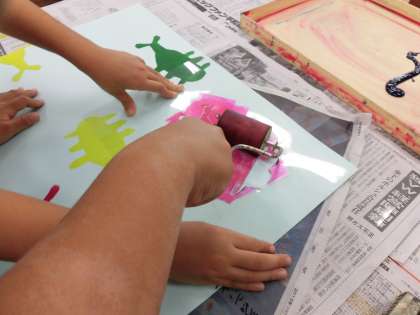 初めて使うローラーに緊張しながらも、友達と協力して素敵な作品を作ることができました。この後は、クレヨンでいろいろな物を書き足し、仕上げをしていきます。