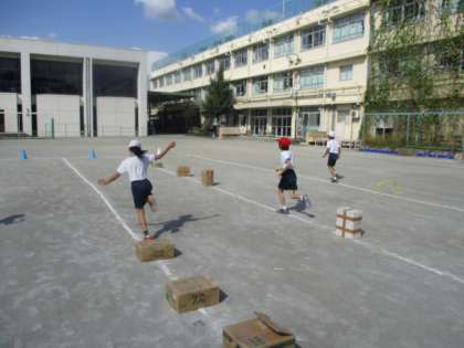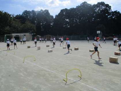 体育科では、校庭でミニハードル走を学習しています。