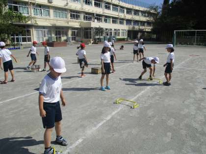 いろいろな形のミニハードルや段ボールなどをコースに並べて跳んでいきます。