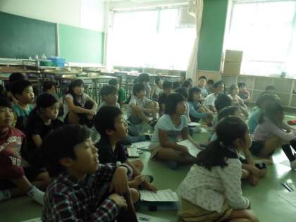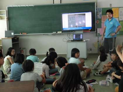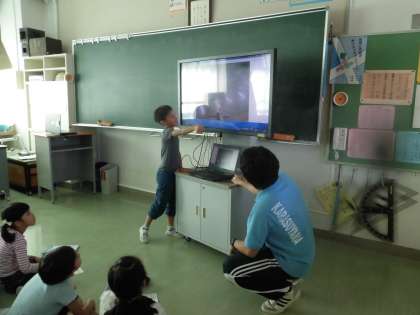 今日は、「ベイ○ックスが投げた紙飛行機が飛んだ長さはどれくらいだろうか?」という問いかけをし、その様子を写した写真を電子黒板で確かめながら学習を行いました。