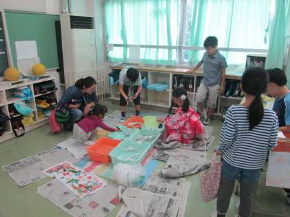 本日、キッズフェスティバルがありました。5年生は、川場村をテーマに1組が1丁目として、迷路やナイトハイク、クイズなどを行いました。2組は2丁目として、田園プラザの中でますつかみなどのゲームを行いました。3組は3丁目として、ナイトハイクを行い、虫や動物が暗闇の中に現れました。