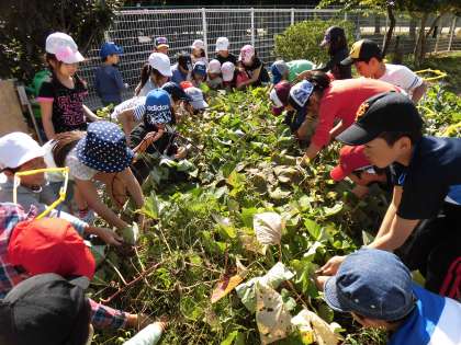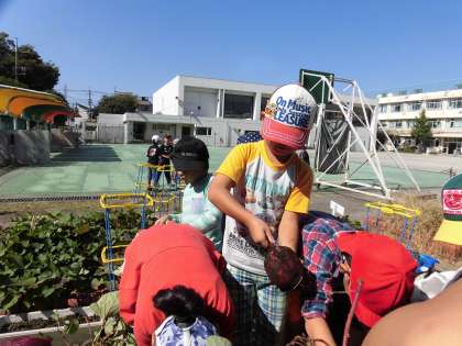 「おおきな おおきな おいも」の絵本を読んでから向かったので、「大きなお芋を掘ってやる!」と気合十分の子どもたちでしたが、残念ながら数が少なく、自分の手で掘ることができなかった人もいました。大きなお芋も掘れたので、教室で乾燥させた後、みんなで分け合いたいと思います。