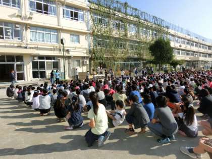 ゲームの進め方を集会委員が説明し、全校が校庭に広がって、“あっち向いて、ほい!”と“ジャンケン”を組み合わせたゲームを楽しみました。