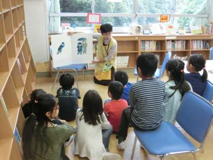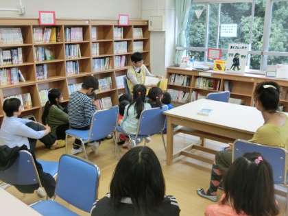 雨交じりの天気の中ですが、10時からの「読み聞かせ・お話会」には、本校児童のほか、未就学のお子さんとその保護者も参加し、学校図書館司書さんのお話を聞きました。