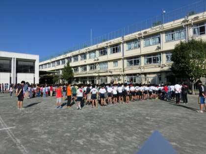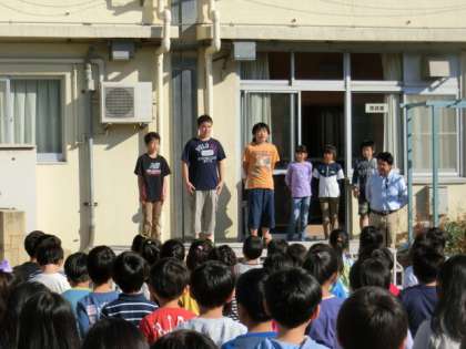 校庭での全校朝会で、校長から3つの話をしました。1つ目は、今月の人格の完成をめざしてのテーマ“公共心”について、2つ目は先週と今週取り組んでいる“縄跳び旬間”について、3つ目は“連合運動会に出場する6年生の活躍”についてです。
