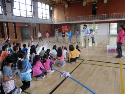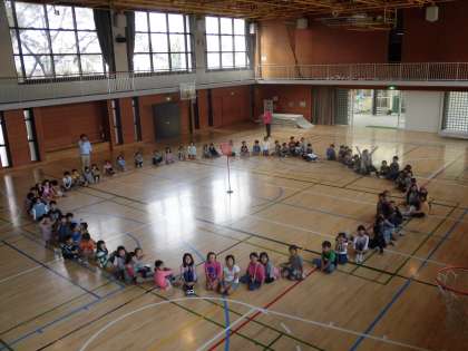 初めに、1列に並んだ子どもたちが前方のかごに玉を投げ入れをしました。「かごまでの距離が違う!」と子どもから声が上がると、どうすれば公平に玉入れができるかということを考えていきました。「みんながかごまで同じ距離なら平等だね。」ということで3年生全体で写真のように並び、「これが円なんだ。」と実際に円の形に並ぶ体験することで理解を深めることができました。