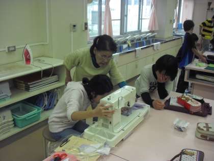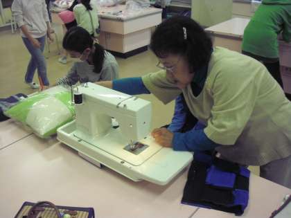 地域ボランティアの方のご協力をいただいて進めているクッションカバー制作。