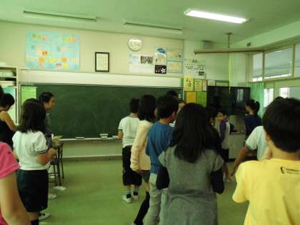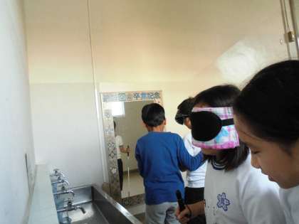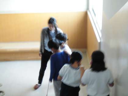 本日4年生は、総合の学習でアイマスク体験を行いました。教室から廊下に出てトイレに行き、階段を降りて2階まで行った後に折り返し、帰りは水道の蛇口をひねり水を触り、教室に戻るというコースでした。ペアになり、一人はアイマスクをし白杖を持ち、一人は介助者として誘導しました。アイマスクで視界が遮られた状態で歩くのは難しく、友達の声に支えられてコースを歩きました。体験後子どもたちは口々に、「怖かった」「手助けしてくれる友達の大切さが分かった」「困った人がいたら助けてあげたい」等と言っていました。この経験を通して、困っている人を助けて、みんなが幸せに過ごせるようにしていきたいという意欲を高めることができました。