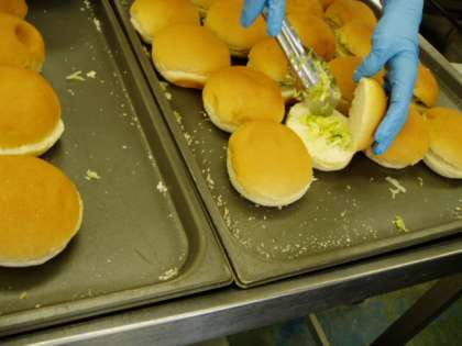 調理員さん達がはさんでくれたキャベツのソテーに、子どもたちが自分の手でチキン竜田をはさんで完成です。