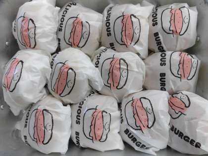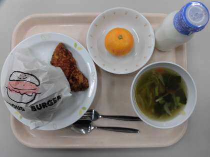 かわいいハンバーガー袋を使って、見た目にも配慮したセルフチキン竜田給食です。