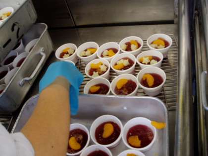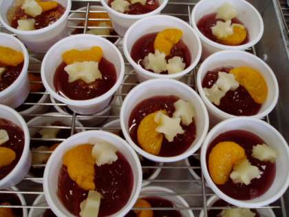 カレーミートソースは玉ねぎ180個をみじん切りにして作られたソースです。また、手作りぶどうゼリーは、展覧会の大看板に飾られている星をイメージした星形のパインをのせてあります。
