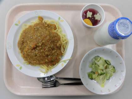 展覧会2日目。土曜日ですが、給食があります。今日の給食も見て楽しめる献立です。スパゲッティーカレーミートソースとぶどうゼリーです。