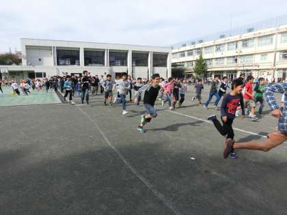 中休みには全員が校庭に出て、準備運動を行い、約5分間を自分のペースで走りました。1年生は、プールスペースで、2年生以上は校庭の学年ごとのコースで、それぞれ各学級ごとのスタート位置から音楽に合わせ、楽しく会話も弾ませながら気持ちのよい汗を流しました。