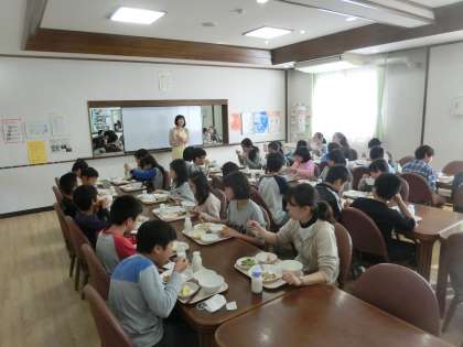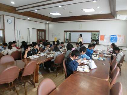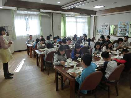 給食の配膳を済ませ、給食をいただきながら、栄養士さんの食育に関する話を聞いていました。今日の利用学年は6年生。食事の量を減らすのではなく、バランスの取れた食事をしながら、適度な運動をすることの大切さについて学びました。また、ランチルームでの給食時には、デザートも付き、子どもたちも楽しみにしています。