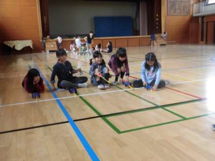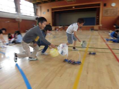 理科「ゴムのはたらき」「風のはたらき」の締めくくりとして、体育館でそれらの力で動く車を走らせました。