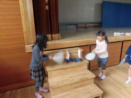 授業の中で確かめた知識を生かして、ゴムの数を増やしてみる子や、風を受ける帆の膨らませ方や数を調整して速く走らせるようとする子など、それぞれに工夫しながら楽しんでいました。