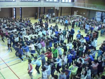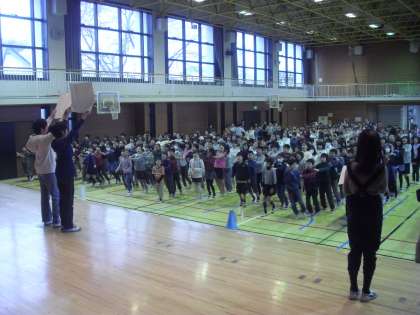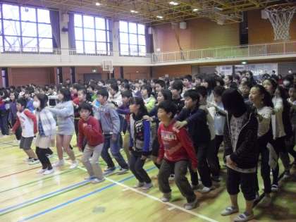集会委員会が「言うこと一緒、やること一緒!」とかけ声をかけ、「前!」と言ったら列を組んだ子どもたちは前へ跳びます。