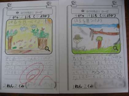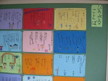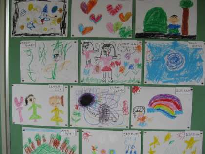 1年生は、学校に入って初めて書いた絵を掲示しています。2年生はこの間行った祖師谷公園で見つけた春の絵や教科書に載っていた言葉遊びを自分なりに変えたものを掲示しています。