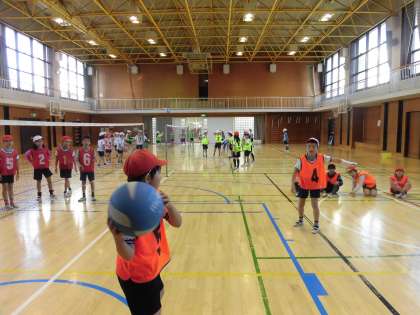 初めて体験するゲームなので少しずつルールを覚えている状態ですが、子どもたちは意欲的に取り組んでいます。チームの仲間と協力してプレーする様子が楽しそうです。