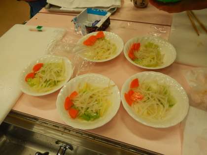 調理実習で、キャベツ、にんじん、もやしの「ゆで野菜」を作りました。ドレッシングはしょう油、す、砂糖、ごま油などを混ぜて中華や和風のものをそれぞれの班で作りました。いろどりもきれいで、子どもたちもおいしそうに食べていました。