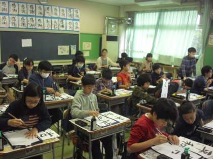 1組では書写の時間に書き初めを行いました。文字の大きさ、文字同士のバランスに気を付けて「平和な春」の文字を書きました。