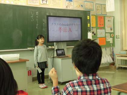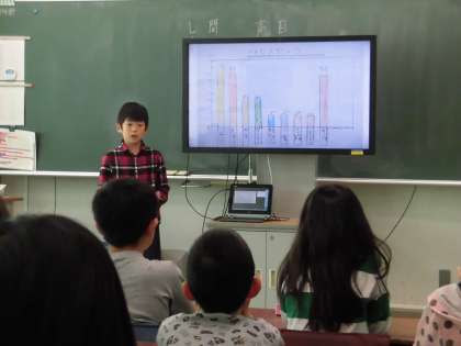 今日は、各グループから代表の子がそれぞれ電子黒板とタブレット端末を使って発表を行いました。自分たちの調べたことを分かりやすく伝えようと原稿を暗記し、話し方や姿勢、目力にも気を付けて発表の練習を行ってきました。
