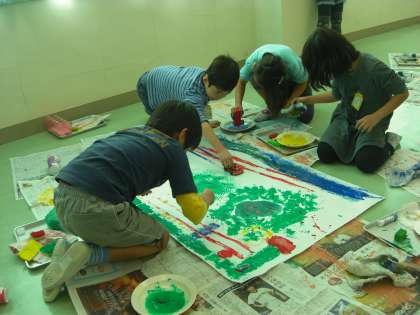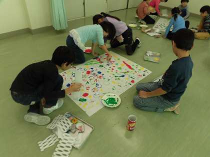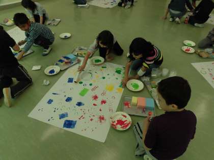 図画工作科「うつして あそぼう」の学習では、日常生活にある形をスタンプのように使い、大きな紙に模様を描きました。