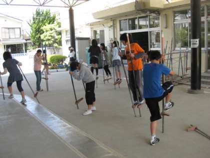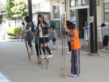 この竹馬。ベルマークで、また新しい竹馬がきました。たくさんの竹馬で元気に