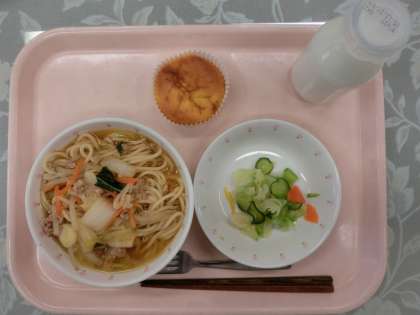 献立は、子どもたちに人気の「みそラーメン」、「きゃべつのゆず漬け」、「かぼちゃケーキ」、「牛乳」です。