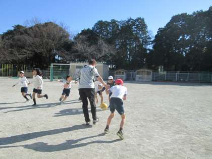 本日は、プロサッカーチームのコーチの方をお招きして、サッカー講座を行いました。友達とのハイタッチから、ボールキャッチ、手つなぎサッカーなど様々な活動を行いました。「考えて行動する」「思いやり」を大切にすることで友達との関係も運動もよりよいものになっていくことを教えていただきました。