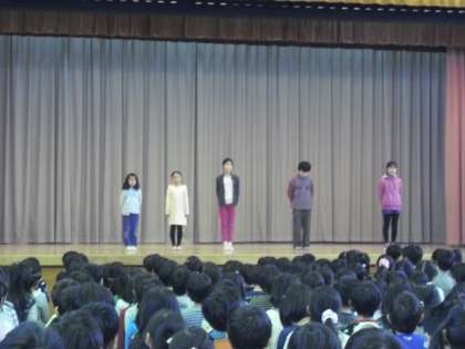 児童代表の言葉では2年生と5年生の代表児童が、2学期を振り返っての話をしました。どの子も立派に発表していました。最後に全校で校歌を歌い、終業式を終えました。