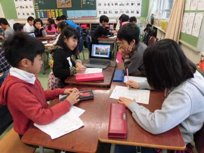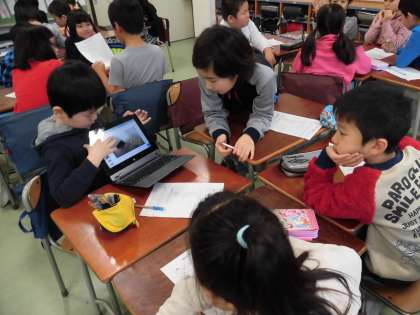 今回の実験では、自分が実験した結果を、その実験をしていない班の友達に説明するという“ジグソー学習”を取り入れました。タブレット型端末を使って記録した実験の結果を、一人ひとりが班の友達に伝えることができました。