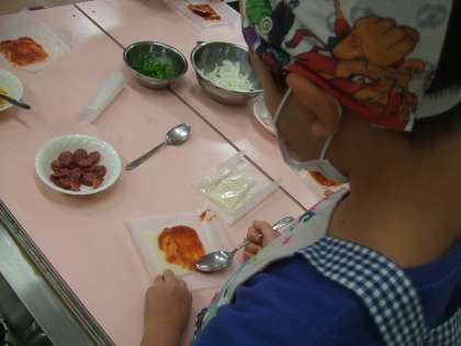 今日は調理学習で「もちピザ」を作りました。スライスされたおもちにピザソースをぬって、自分たちでトッピングをしてから焼きました。準備や片付けを協力してすることができ、また、友達とトッピングの相談をしながら楽しんで作る様子も見られました。子どもたちは、お正月で食べたおもちがピザになる様子を楽しみながら調理をし「おいしい。」の声がたくさん聞こえました。