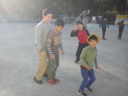 今朝は縄跳び旬間の「ジャンピングタイム」の取組として、1年生とともに縄跳びを行いました。6年生は1年生に教えてあげたり、どちらが上手に跳べるか競争したり、一本の縄で一緒に跳んだりしながら楽しく取り組んでいました。