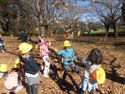 冬を見つけに公園を歩いたときには、秋には見られなかった「しもばしら」を見つけ、ふむとサクサクと音がなることや、触ると冷たいことなど体感していました。また、たくさんの落ち葉を放ってシャワーに見立てたり、たくさん集めて「ふわふわのお布団みたい」と集めた落ち葉に乗ってみたりして、思い思いに冬を楽しんでいました。