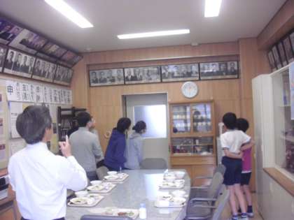 校長先生から「後藤校長は第何代の校長でしょうか。」というクイズが出されると、子どもたちは室内の歴代の校長先生の写真などを手がかりに、答えを出すことができました。その後子どもたちは、普段校長先生にできないようなプライベートな会話や質問をしながら、会食会を満喫したようです。